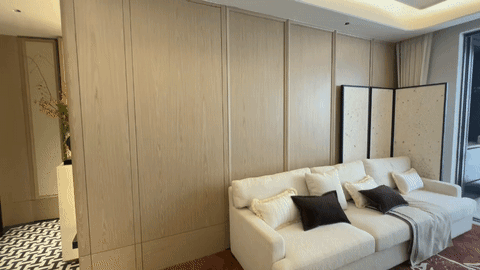 灰整石流水如诗如画,所有户型都采用了南北通透、全明朴直的设想手法,柜板是实木贴皮的饰面!